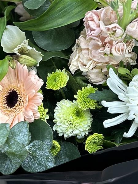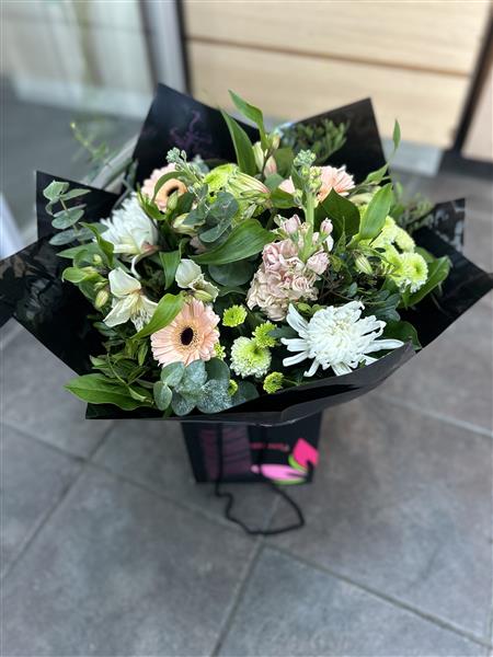 A delightful gift bag of pale peach and whites, including seasonal flowers such as roses, gerbera, alstromeria with eucalyptus