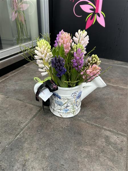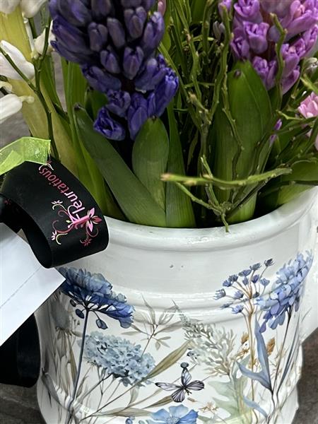 A selection of beautifully scented cut Hyacinth in a stylish floral jug